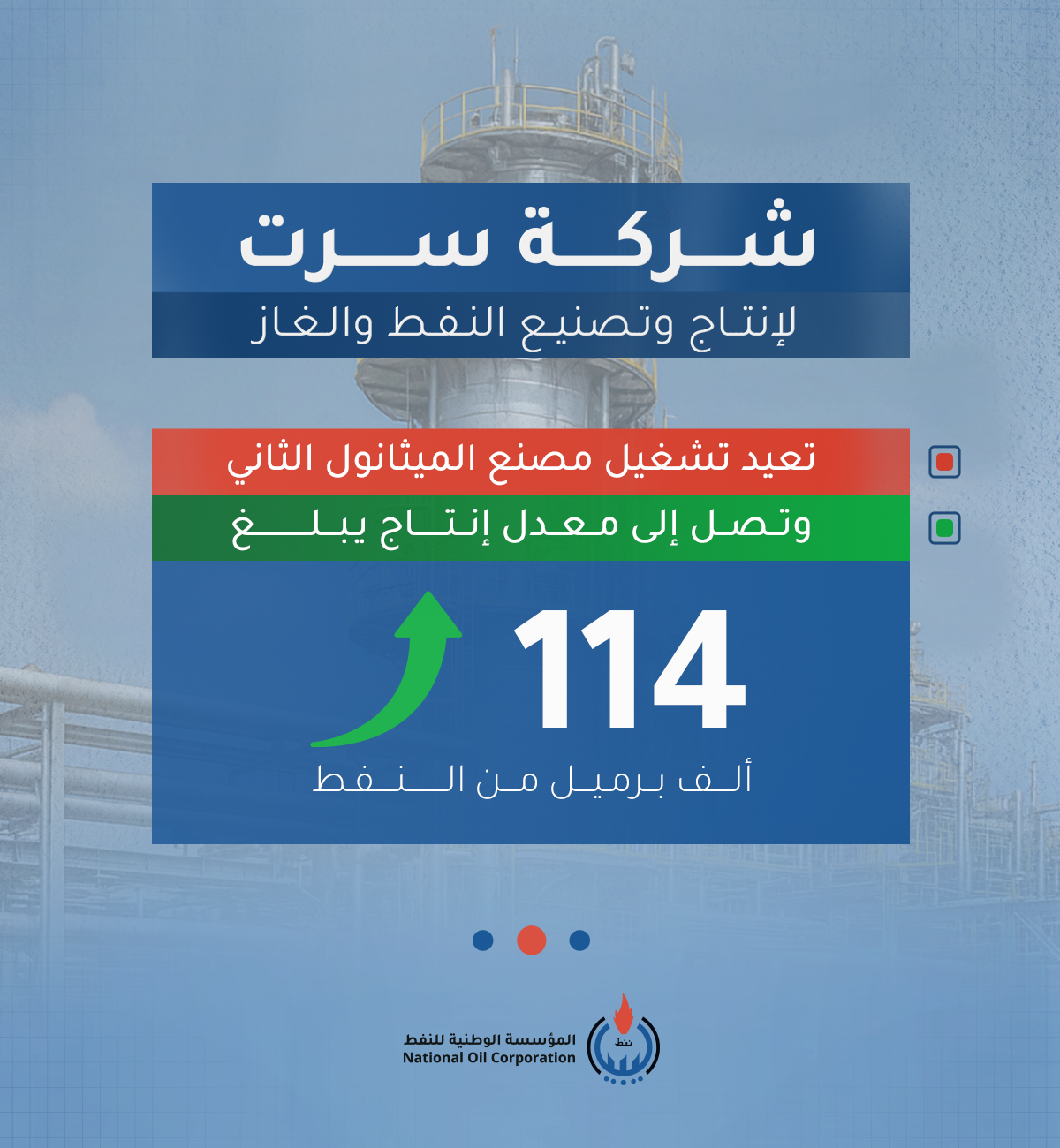 شركة سرت تعيد تشغيل مصنع الميثانول الثاني وتصل اليوم إلى معدل إنتاج يبلغ 114 ألف برميل من النفط