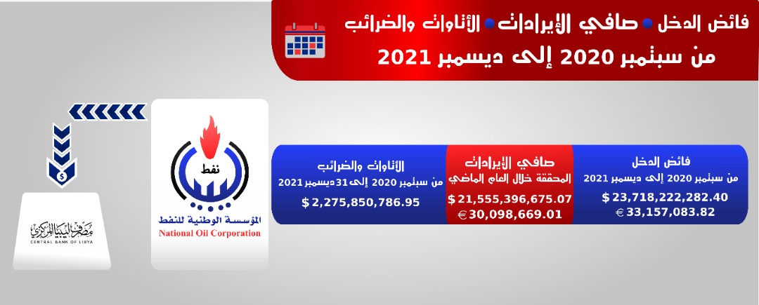 The total net revenues achieved during the past year amounted to 21,555,396,675.07 billion US dollars and 30,098,669.01 euros, while royalties and taxes have been recorded since the lifting of force majeure in September of the year 2020 until December 31, 2021, an amount and capacity of 2,275,850,786.95 US dollars and it was deposited in the account of the Ministry of Finance with the Central Bank of Libya, provided that royalties and taxes will be withheld in the coming months for the South Refinery and infrastructure projects in accordance with the decisions of the Council of Ministers in particular.